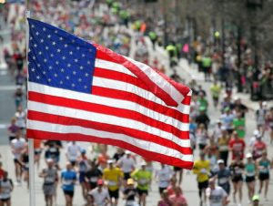 BOSTON, MA – APRIL 18: An American flag is seen as runners make their way to the finish line during the 115th running of the Boston Marathon on April 18, 2011 in Boston, Massachusetts. (Photo by Jim Rogash/Getty Images)