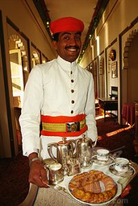 SuperStock_1663R-18974 Published by Gehan in Portrait of a waiter holding a tray and smiling, Fateh Prakash Palace, Udaipur, Rajasthan, India